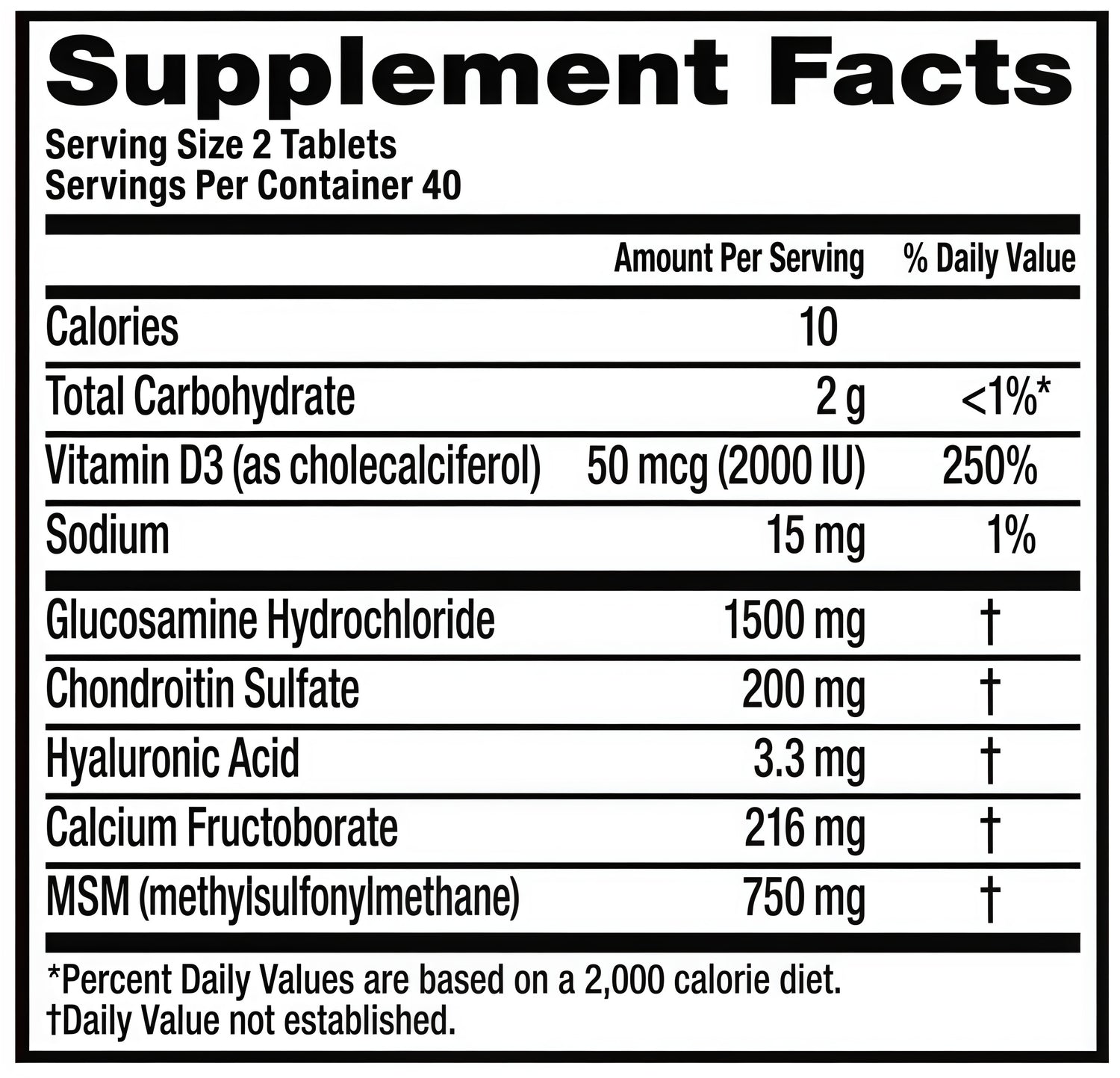 Methylsulfonylmethane (MSM) is a source of sulfur found in the body that is important in the formation of collagen in joints, collagen is a vital part of your joints because it supports the structure of cartilage. Vitamin D3 helps maintain healthy levels of Calcium and Magnesium, important minerals that support strong bones.